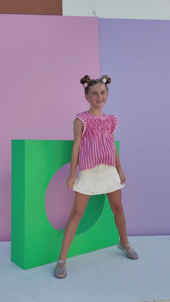 The Chloe Top is a pink-striped girls’ top that adds playful polish to everyday dressing. With a stretchy smocked chest and flutter sleeves, it offers a comfortable, stay-put fit that still feels special. An easy favorite for school, spring outings, and sunny-day style for your Bisby girl!